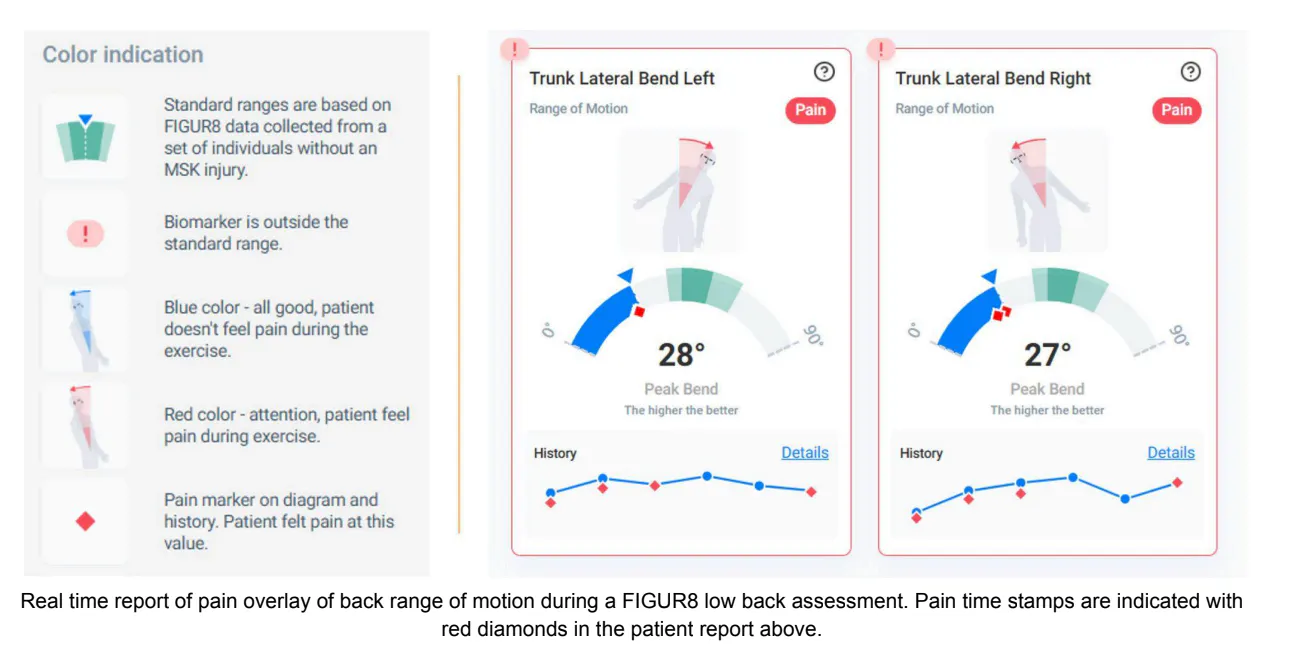 The principle of the importance of tracking ROM and pain as biomarkers is timeless, and twenty-five years after the release of this study we now have tools to track pain during low back movement. The FIGUR8 biomotion Assessment Platform (bMAP) captures key biomechanical metrics, including pain, during a set of activities which are chosen specifically to provide the most clinically relevant information for treating persons with low back pain. The Low Back Assessment captures joint angles and muscle function in all 3 planes of motion during dynamic activities allowing clinicians to objectively quantify what our eyes see as the client moves, and also measure what our eyes can’t see. Tapping a button during data collection allows the clinician to identify the moment(s) in time that the patient reports pain throughout the movement trial. There is a clinical advantage of the FIGUR8 app’s ability to timestamp multiple pain points during each trial rather than a binary Yes/No (as recorded in this study, and as is common practice in PT clinics today). Each pain timestamp is associated with trunk ROM data, enabling clinicians to track the range of pain-free movement over multiple clinic visits.