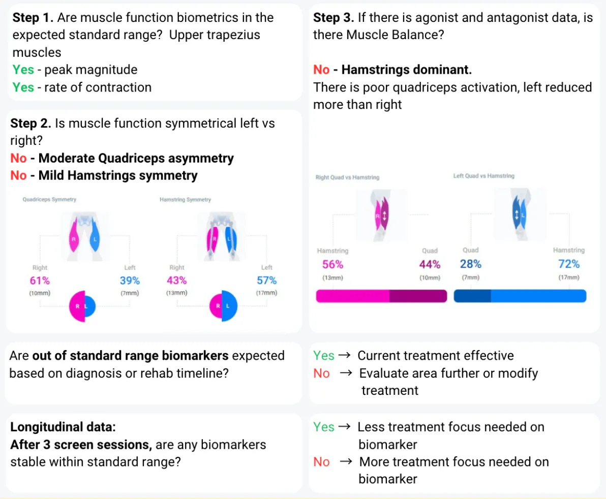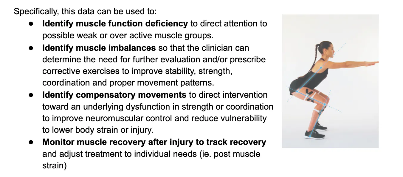 To gain quick, objective measurable insights on how an individual moves.sMMG data helps identify deficiencies, compensations, and asymmetries that aren't always visible, guiding the clinician to target specific areas with greater accuracy. With clearer information up front, clinicians can make faster, more informed decisions and tailor interventions that lead to better outcomes.