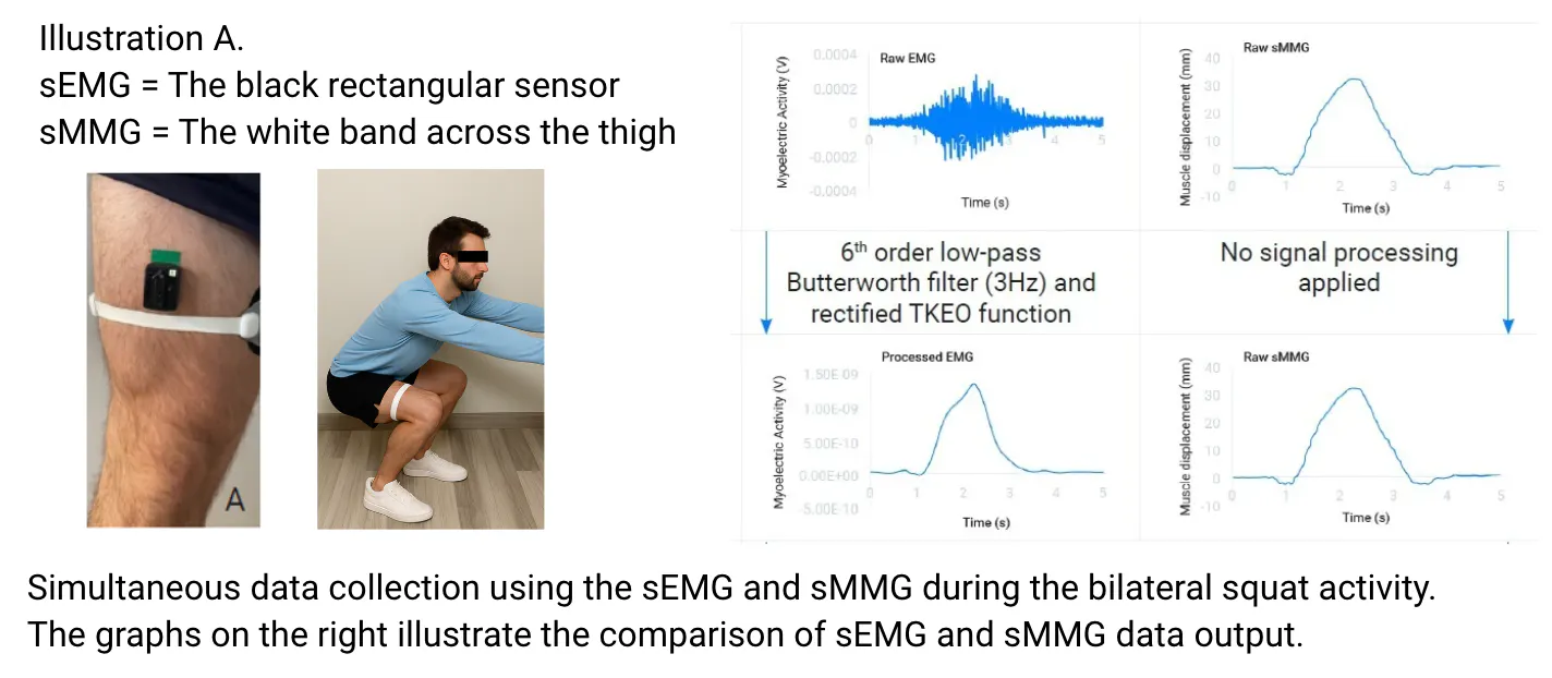 Mechanomyography is a non-invasive technique that measures the mechanical components of muscles during a contraction (Scarborough et al 2024; Linderman et al 2023; Madeleine et al 2001; Ibitoye et al 2014). Mechanomyography can be used to identify and measure physical properties such as the timing of muscle activation, duration of a contraction, and the magnitude of a muscle contraction. When these metrics are captured during dynamic activities, they provide valuable information that clinicians can not see with their eyes or easily measure. Objective data that measures muscle function can better inform clinicians during a neuromuscular evaluation, when designing rehabilitations programs, and performing wellness screens.